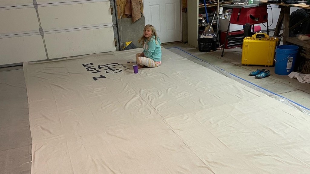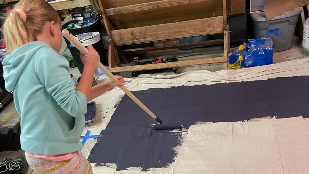 There is a lot to say about this project that I’ll have to blog about. For this space though, I’ll just give a summary and a brief slideshow. The canvas is made from two, 9′ x 12′ painter’s drop cloths that I ironed and then sewed together to make 24′ wide. The finished painting is 20′ wide, leaving enough salvage on the sides to wrap around the frame. It took 60 hours to create + 3 hours and a team to install.